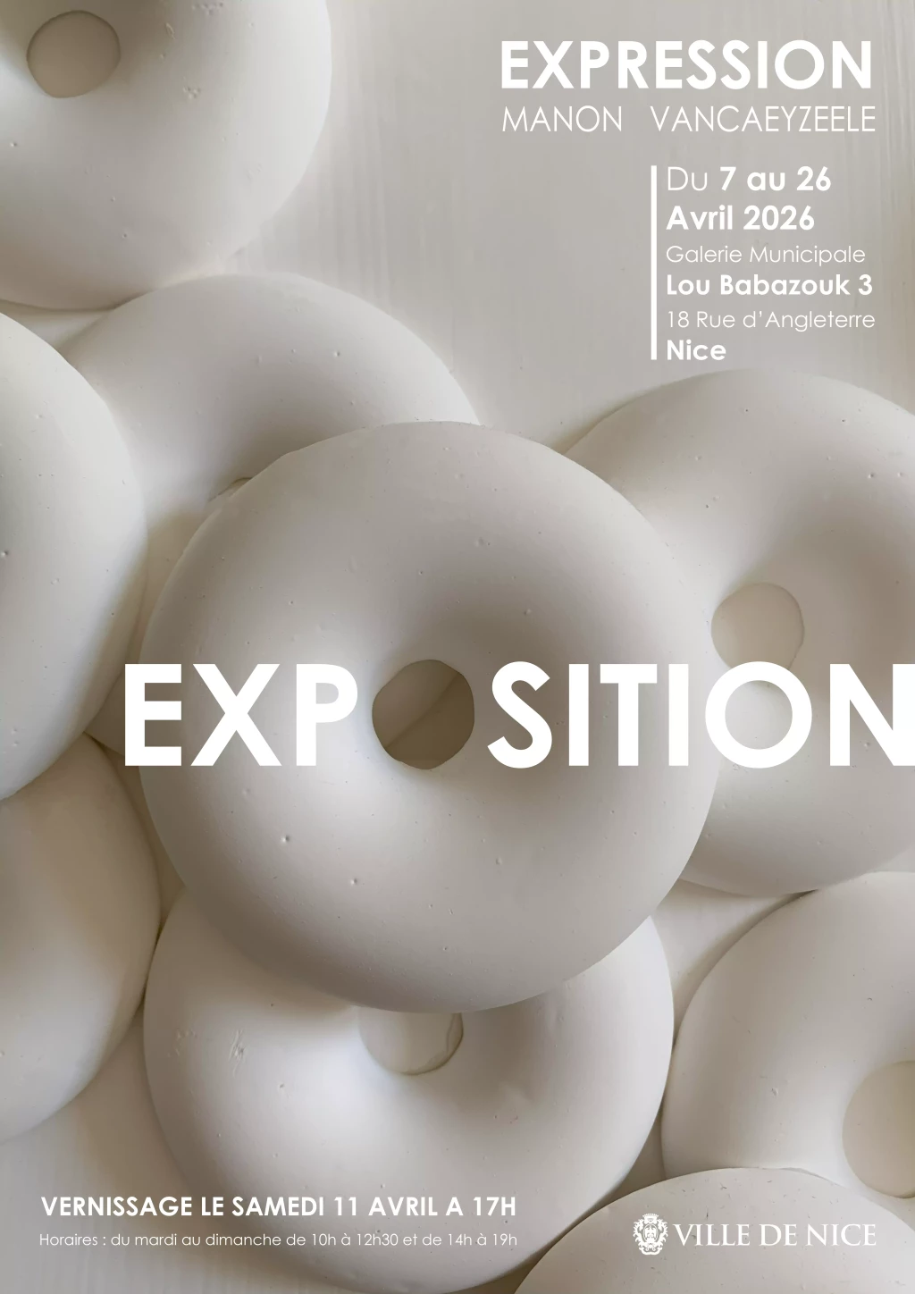 Expo Exposition de Manon Vancaeyzeele Manon Vancaeyzeele, architecte, développe un univers nourri par la matière et l’imaginaire. NICE - Provence-Alpes-Côte d'Azur 07 avril 2026 – 26 avril 2026