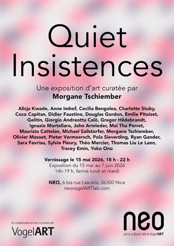 Expo Quiet Insistences « Quiet Insistences » est une exposition collective curatée par Morgane Tschiember. NEO VogelART LAB NICE - Provence-Alpes-Côte d'Azur 15 mai 2026 – 07 juin 2026
